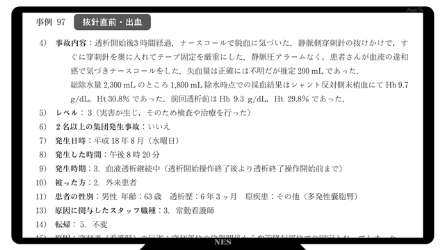 事故防止に関する研究』報告書にあった事例では、透析回路に亀裂が生じて『失血約30mL』があった事例を『レベル3』と評価しています。