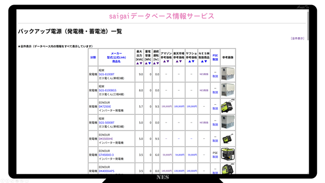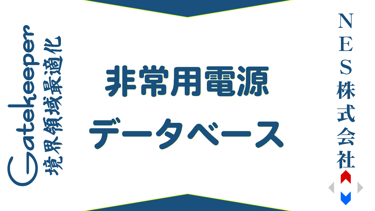 カテゴリー BCP 医療機器・設備・環境 療養住環境 知る・学ぶ・楽しむ 電気工事 非常用電源データベース | 登録電気工事業者 | NES株式会社 投稿者 作成者: Gatekeeper 投稿日 2025年12月8日 非常用電源の製品リストを自主制作しました。 各社の公開情報をもとに作成したリストです。 バックアップ電源一覧 (※.撮影時点の画面構成) 呼称絞込 フリーワード絞込の項目選択: メーカー 型式 商品名 数値絞込 数値絞込の項目選択: 最大出力 蓄電容量 連続運転 ← 登録電気工事業者の番号が変わりました | NES株式会社