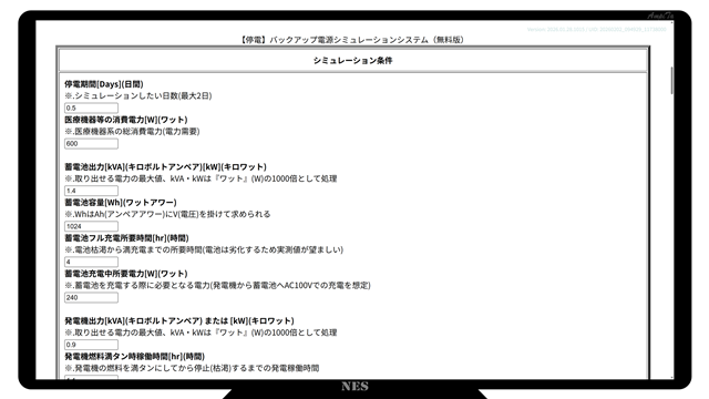 電化製品と予備電源の仕様を入力することで療養住環境における電源枯渇時期を予想するシミュレーションシステムをウェブ上に公開し、無料で利用できるようにしました。