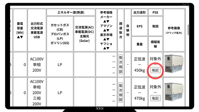 データベースサイトに表示される『転記』ボタンを押下するとシミュレーションシステムの条件設定欄に仕様が転記される仕組みです。