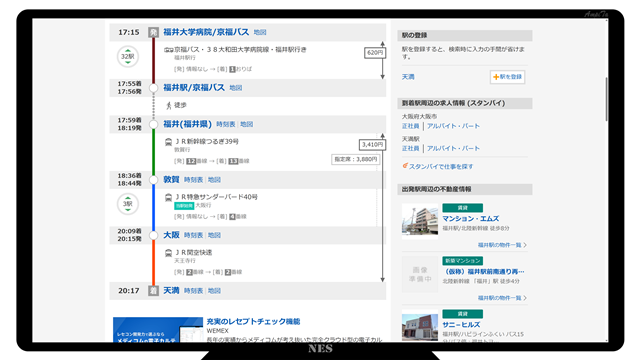 3日目の帰阪ルートは福井駅から北陸新幹線で1駅、敦賀からサンダーバードで3駅目の大阪駅下車、環状線で天満に帰っています。路線距離201.0km、料金は7,910円です。