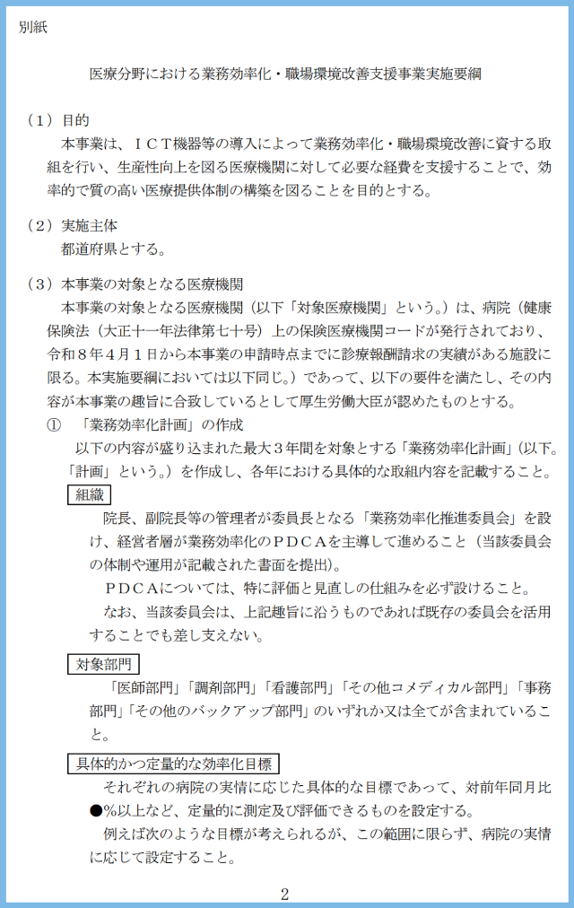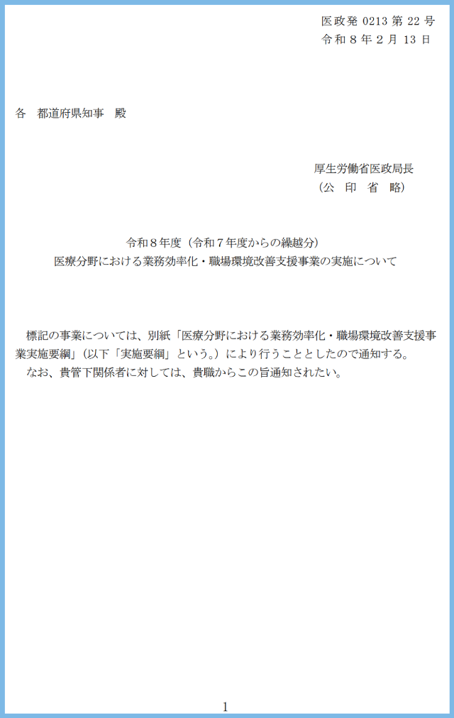 2026年2月13日付の厚生労働省医政局長通知『医療分野における業務効率化・職場環境改善支援事業の実施について』(医政発0213第22号)では、同事業の実施要綱が示されました。