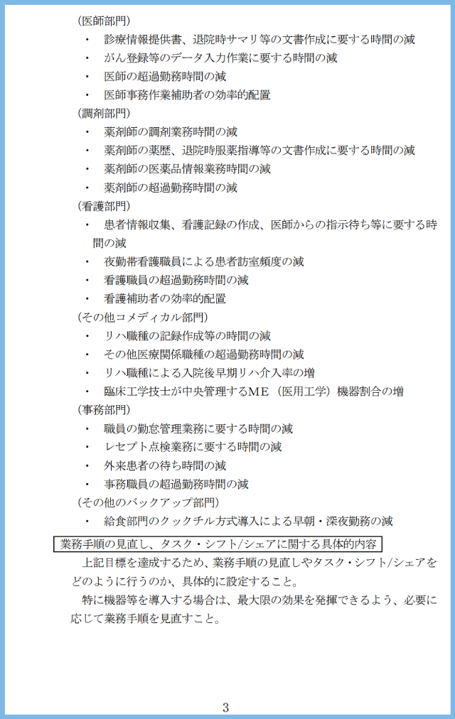 上記目標を達成するため、業務手順の見直しやタスク・シフト/シェアをどのように行うのか、具体的に設定すること。