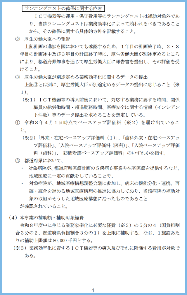 令和8年度中に生じる業務効率化に必要な経費(※3)の5分の4(国負担割合3分の2、都道府県負担割合3分の1)を上限に補助する。なお、1施設あたりの補助上限額は 80,000 千円とす。