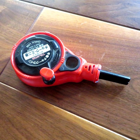 チョーク粉を使った墨壺です。片端には針が付いており、刺して位置決めします。他端を強く引いて糸を張り、糸をパチンとはじくと線が引かれます。